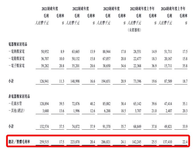 与此同时深富策略,香江电器2024年上半年毛利也在减少,由2023年的1.42亿元降至1.37亿元。2024上半年毛利率随之下降为22.36%,对比之下,2023上半年为25.5%,2023全年为24.1%。其中,2024年上半年公司的电器类家居用品与非电器类家居用品毛利率双双下滑。